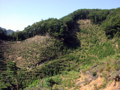 作業道が幾筋も通じている伐採植林地・左奥は仙人ヶ岳