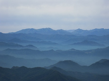 平坦尾根が終わりだんだん傾斜がきつくなると展望が開け、さらに登るほどに意外な遠望が広がり、そればかりか平地を覆う靄がまるで南画の世界を繰り広げて、それは素晴らしい眺めに。やはり山は登ってみないことにはわかりません。