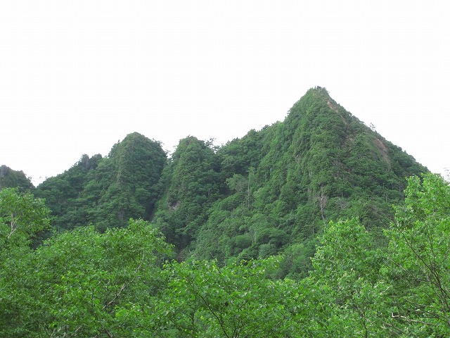 コルから1901m峰にかけてはコメツガが茂りいかにも山深く分け入った気分です。さらに小さなコブを越えるといよいよ鋸山の鋭い山体に取り付きます。見上げるといったいどこをどう登るんだと思うような急峻な鋸山です。