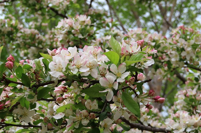 展望台でお会いした皆さんがクルマで追い越す際に便乗をお誘いいただいたのですが、すぐそこに駐車していますので、と辞退したところ、これが遠い、遠い、乗せていただくのだったと後悔しきり。(^_^; とはいえ、頭上のミツバツツジ、シロヤシオ、ヤマツツジなどを見上げながら歩く林道もまた楽しいものでした。ここを歩くとこの林道が袈裟丸山の端っこではなくまさしく山中深く刻まれていることが判ります。田沢奥山から延びる村界尾根やバラ沢峠から続く神戸山など袈裟丸山群は延々と南にも尾根を張り出して、本当に根張りの大きい壮大な山群であることが実感できます。