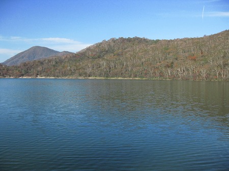 堰のあたりから見る小沼は遠景に黒檜山を配してなかなか好ましい姿です。既に紅葉は終わってカエデの仲間だけが居残りのように色づいていました。