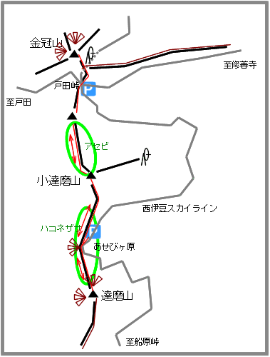 一旦先ほどの登山口まで戻り、そこから芝草の登山道を登って小達磨山まで登ります。芝草、ハコネザサ笹原、アセビ樹林、イヌツゲ樹林が代わる代わる続いて表情豊かな変化のある山道です。特筆すべきはアセビの樹林で、成長の遅いアセビとしてはかなりの樹齢と思われる木々が純林を形成しています。アセビは他の植物の成長を抑制すると言われていますのでこうした純林ができるのかも知れません。ただ、イヌツゲだけは混交して、他所でもアセビとイヌツゲが共存している森があるようですのでアセビに抑制されない性質でもあるのかも知れません。