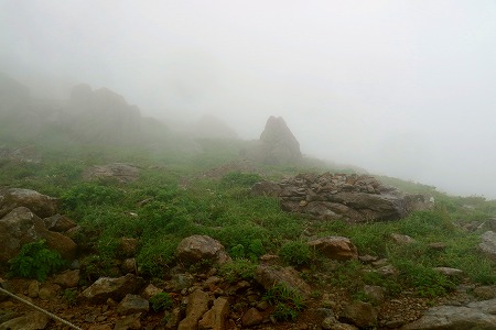少しだけ傾斜が出てきたなと思うとすぐに灌木帯です。樹林内では小雨ながら霧もなく穏やかな天候でしたが樹林が切れて灌木帯になるとすっかり濃霧に包まれてしまいました。徐々に傾斜が出てきてさらに高度を上げると雨も激しくなり風が出てきました。