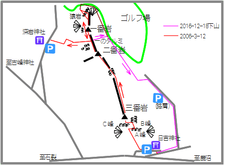 コースは日吉神社の階段登りからスタートします。日吉神社から狭い舗装道路をわずかに西に進むと右に山道が分岐します。山道に入りわずかでA峰、B峰、C峰の岩場に突き当たります。どれがどれやらわかりませんが、ベンチのあるのがC峰上部だそうで、それから察すると最初に見えるのがA峰のようです。さっそくA峰の岩上で展望満喫。C峰まで岩の登路が続きますが、岩にはステップが切ってあるのでさほど苦労はしません。