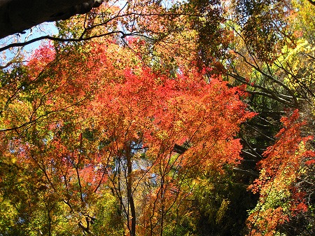 大円地越から大円地に向かって下り始めるとすぐさま赤や黄に染まった葉が陽に輝いて紅葉のオンパレード。こんな低山でこれほどの鮮やかさにはそうそう会えるものではありません。途中、植林地を通るもののそれ以外では大円地までずっと鮮やかな紅葉が続きました。