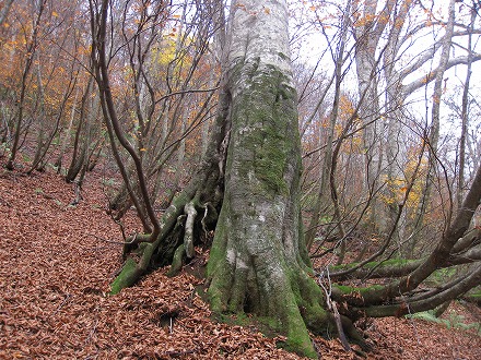尾根はブナに覆われていますが豪雪と強風の影響かあのすっくと立った斜面のブナの木とは違ってねじ曲がってその姿はとてもブナとは思えません。中には途中で1回転しているのや曲がって絡み合ったのなどもあり、この稜線の気候の激しさを物語っています。