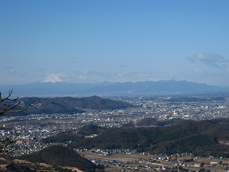 やがて露岩が多くなってくるとやや痩せ尾根になり所々で北側の展望が得られます。思いもしていなかった広大な景観です。そして378m峰に登り着くと展望はさらに開けますがもう少し尾根をたどると岩の棚の上に出て広大な眺めが広がっています。南から右へ富士山、秩父、八ヶ岳、西上州の山々、浅間山、浅間隠山、榛名山など関東をとりまく山が一望です。そして赤城山が真正面に大きく聳えていますが、北風に乗った雪雲が頂上部を隠していました。