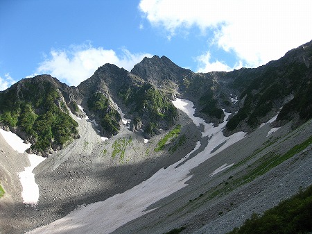 所々展望の開ける箇所があってまさしくパノラマコースです。涸沢を見降ろすその景観は圧巻です。また前方視界いっぱいにのしかかるように聳える北穂高岳も涸沢の底から見る姿とはまったく異なってその大きさに圧倒されます。さらに槍ヶ岳が意外な近さで、小屋まで手に取るくらいに見えます。そして初めて眼にする横尾本谷源頭のカール、たぶん手つかずの自然であろうことはここから見上げるだけで想像できます。私たちには行くことはかないませんがどんなにか素晴らしい別天地でしょう。