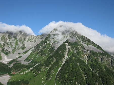 とはいえ、悪天候というわけではないのであっちが曇ればこっちが晴れるという按配で、槍ヶ岳方面が見えたと思うと次には双六岳、水晶岳方面、また少し待つと今度は常念岳、蝶ヶ岳と次々現れては隠れて忙しい山岳同定となりました。
