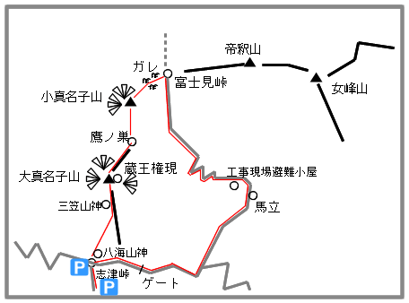写真は男体山登山口先の路肩。【コース】 志津越え駐車地 - 大真名子山 − 鷹ノ巣(鞍部) − 小真名子山 − 富士見峠 − 馬立 − 志津越え