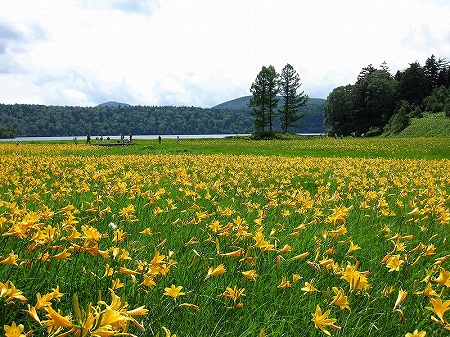 ビジターセンターから大江湿原は目と鼻の先、すぐにニッコウキスゲ群落です。