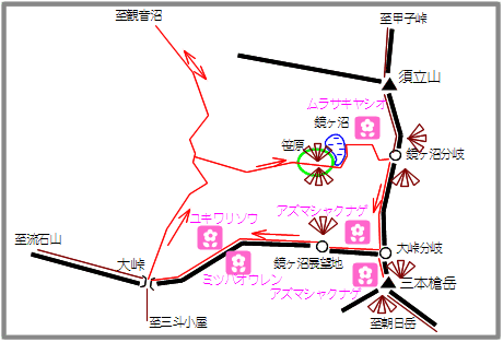 車道の通行止めのおかげで余分に歩かされて(普段のトレーニング不足も加わって)けっこう難儀な山行となってしまいましたが、それをもってしても充分すぎるほどの素晴らしい山行となりました。静寂の登路、広闊な大展望、そして満開の花たち、ほぼ私たちだけ独り占めの那須を心ゆくまで楽しんできました。
