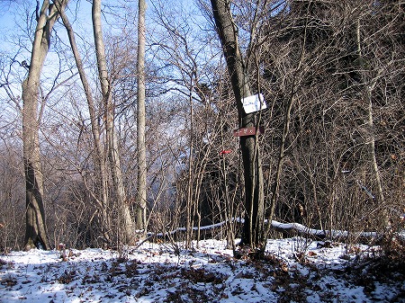 緩やかな尾根がしばらく続くと地形図にはない尾根越えの林道に降り立ちます。鹿の足跡のみのまっさらな雪道です。林道をたどると帰路とは逆の方向へかなり引っ張られてしまいます。はたしてこれでいいのか心配になったころ地図上の林道(観音入林道)と合流してやっと方向を戻し、あとははうんざりするくらいの舗道歩きの末、満願寺の裏手を通って登山口に戻りました。 |