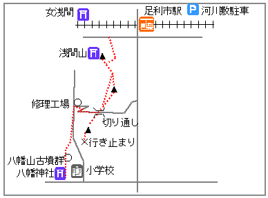 南側の山越えの道の峠付近にも2,3台分の駐車地があります。(写真)【コース】 東武足利市駅 − 参道入り口 − 尾根 − 富士浅間神社 − 切り通し − 八幡山古墳群 − 八幡神社
