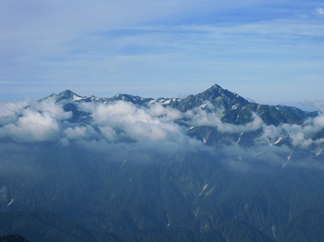 あっという間にさらに晴れ上がって遠く槍ヶ岳、奥穂高岳、前穂高岳、乗鞍岳まで見通せるようになりました。もちろん同じ後立山の唐松岳、鹿島槍ヶ岳なども見通せます。眼下には名もないカールが次々と姿を現しその下流では黒部の支流清水谷が深く谷を穿ってなんとも雄大な景観です。