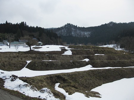 まだ棚田は雪に覆われていますが棚田の土手は真っ先に雪が解けるようです。