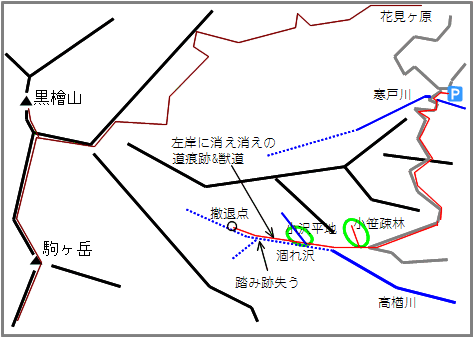 林道分岐−入山点−小笹の疎林入り口−沢二股−撤退点 (往復)