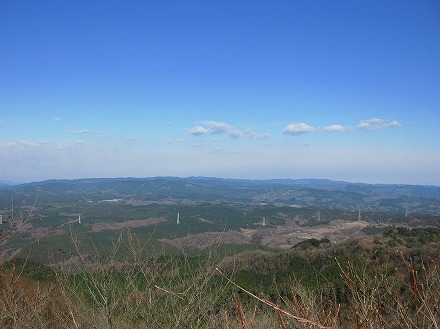 内陸に目をやると準平原にも似たほぼ平坦に見える阿武隈山地南縁の山々が連なっています。たぶん土岳や堅破山などを見ているはずですがほぼ真っ平らに見えてどこがどれやら皆目わかりません。はっきりわかる存在と言えば風力発電風車群のある里美牧場と優美な姿の八溝山と高笹山、それに木々やアンテナ群に邪魔されて限られる視界の端に見える奥久慈男体山くらいなものです。この茫漠とした準平原様の山々が阿武隈南縁から常陸北部に続く山々の特徴であり魅力であると言っていいかもしれません。