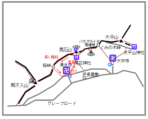 申し訳ないけれど参拝をスルーして清水寺から右手に回り込み常緑樹の中を登ります。いきなり急登です。先ほど駐車場から見上げたとおりなので急登なのは仕方ありません。この先晃石神社に登り着くまでこの急登は許してくれません。展望もない中やっせやっせと登るのみです。
