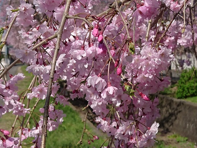 近所の紅枝垂れ桜が満開です。
